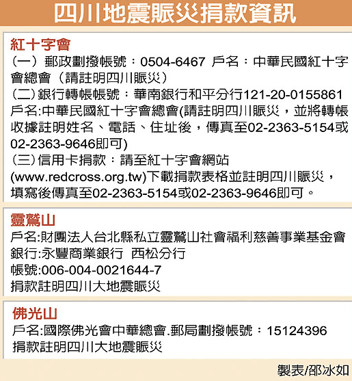 目前台灣救援及善心公益團體很多,如紅十字會、慈濟、靈鷲山、佛光山、法鼓山、救難總會等等,在媒體上都有捐款帳號、各地也都有連絡人,只要你有心,都可以前往捐款。