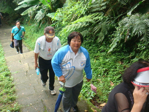 在這次登山活動中,我個人看到了許多堅持、忍耐、與溫馨的一面,林進天會長高齡71歲,夫人房子華64歲,尤其林夫人有心臟病,體重較重,登山對她而言可說是件非常艱辛的事。登山開始約1/3路程,林夫人己顯露疲態,約1/2路程時,與主隊己差一大截,且邊走休息,然而林會長多次念著非常心疼,而我與總幹事陳文勝在半路涼亭等侯多時,林會長賢伉儷,仍堅持百忍,一步步的走到2/3路程之頂端第二座涼亭,完成了一半路程。到達涼亭時獲得所有與會貴賓熱烈的掌聲鼓勵;然而艱鉅的任務並未因此而結束,下坡路段對林夫人來更是辛苦,老人家的膝蓋承受不了身體的重量,可是林夫人非常堅持完成全程登山路程,大約花了2小時25分鐘,對於林夫人的堅忍精神,直叫我們感到佩服與肯定。