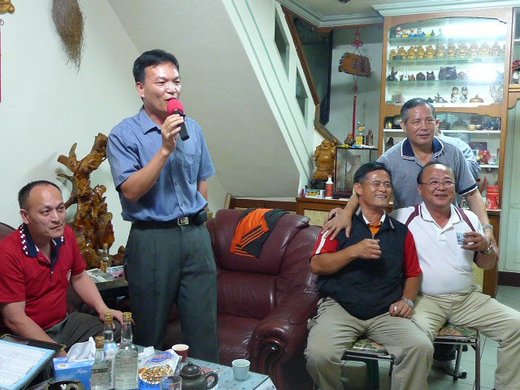一行人當晚接近7點抵達苗栗國揚飯店,德仁學長己在飯店門口等候多時,進入餐廳以後,本人即代表協會致詞,為表達協會對兩位顧問之重視,特別安排本次盛宴,以表達感謝之意,也說明了我等對學長們崇高的敬意及謝意。無奈說還没說完,謝德忠顧問,即舉手表達反對意見,並用高亢的音調表示怎麼可以叫來自遠方的朋友到我們的地盤請客,不可以。其弟弟德仁學學長亦附和說,我大哥請吃飯,四位貴賓晚上住宿我安排。這下,我們四人聽到傻眼了。本來請顧問倒反而被請,真是糟糕。當晚在許多友人進進出出,熱烈把酒語歡的情形,一攤接著一攤,到苗栗前副指揮官家、又到市區吃宵夜,直到淩晨3點時許才進入飯店洗澡、睡覺。好累哦!但心存感謝。