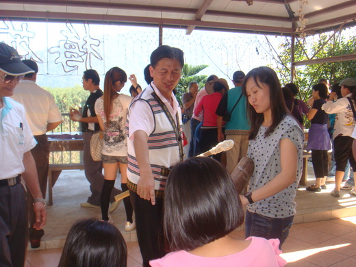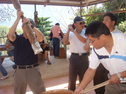 行動於上午11點30分在梅花山莊進行麻糬實作,由梅花村村長免費提供,現場許多男士以木杵實際搗碎,過程非常有趣但非常耗費力氣,許多友人還是第一次吃到麻糬配鹹魚、配蜂蜜,覺得非常稀奇。12點30分開始品味泰雅美食,桌上佳餚特別安排竹筒飯、竹雞、山蔬等泰雅美食,在陳文勝及團員配合歌唱下,渡過完美午餐。