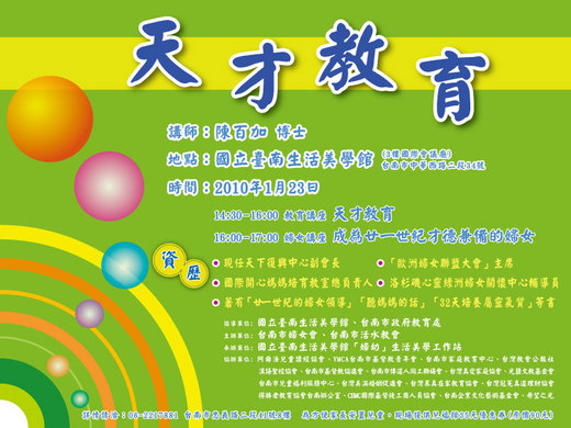迎蒞臨 1月23日 「天才教育」&「成為廿一世紀才德兼備的婦女」臺南生活美學館!