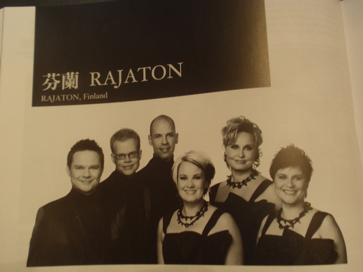 回台灣剛好碰上台北國際合唱節,一連串音樂會只有芬蘭 RAJATON 的六聲部無伴奏人聲團體可以配合我的行程,得到消息馬上網路購票,拿到兩張不錯且稍前的位子,很開心的在七月二十八日到國家音樂廳聽音樂會.