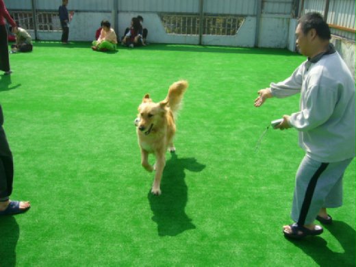 大概是天氣太熱了,熱情奔跑不到十五分鐘,小笨熱到舌頭都歪一邊,趴在陰涼處休息,小玲趁機上前要跟小笨握手,沒想到小笨真的坐起身子、伸出前腳跟小玲握手了,讓小玲樂得跟老師說,小笨跟我握手了耶!