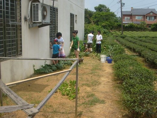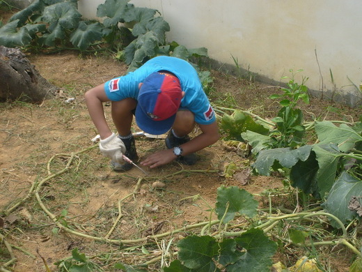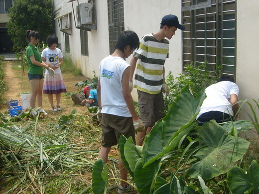 事前的聯繫中,阿秉就說要幫教養院處理菜園的雜草,雖然上午太陽很大,幾位大男生還是捲起袖子跟著溫老師到菜園去,本來社工請曜宇跟著姊姊到教室裡幫老師的忙,他卻很有男子氣慨,揣起帽子衝到菜園去幫忙,人小志氣高呢!