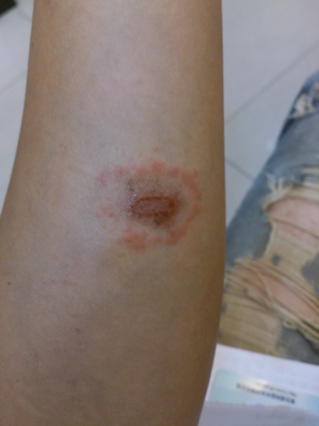 我不太確定這傷口到底打哪兒來的,如果是隱翅蟲、如果我是不小心壓到牠,傷口應該會一大片,但沒有,若不是隱翅蟲這橢圓形的傷口又是什麼玩意兒造成的?乍看之下有點像是灼傷,但我手臂沒靠近任何可能燒傷的東西,而且中心的橢圓傷口看來掉了一層皮,真正可怕的是周圍一圈貌似皰疹的東西。