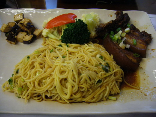 說實在,這份大肉麵口味普通,說是家傳麵食我倒願意相信,吃起來沒有距離,蠻接近一般家庭煮麵的感覺,只是它以西餐的方式呈現在客人面前,實質上仍是中餐,連焢肉都像咱們在便當店裡吃到的焢肉,相當家常;唯一意外的是麵量,恐怕店家是擔心客人吃不飽,麵量加得很多,真的是光吃麵就會塞飽了。