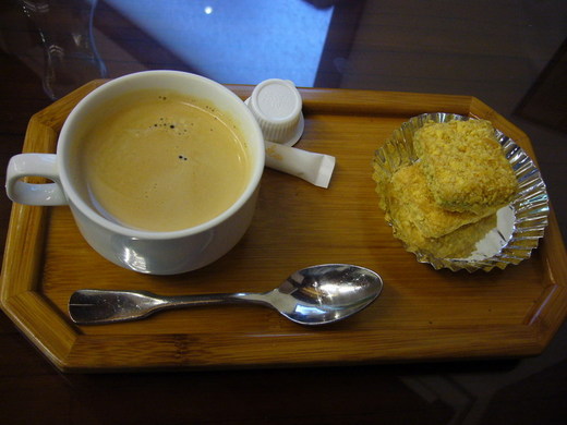 餐後服務生送上飲品與甜點,飲品共有三種,分別是冷熱咖啡、熱中國茶與冰檸檬茶,可想見也都是好準備的飲料,方便端上桌。我和阿海都點熱咖啡,甜點則有不同口感,是兩塊蠻適合搭配咖啡的夾心餅乾,甜點與咖啡剛好補足還有空隙的胃。