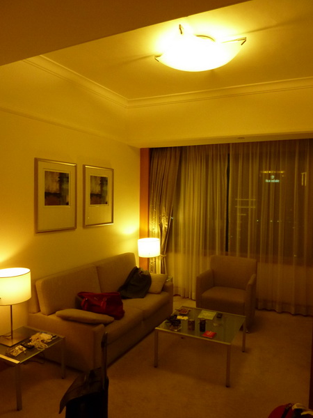 回到房間,她一屁股坐在沙發上,這才嚷著累了。這次來港四天三夜,透過「自遊網社」找上這間看得到維多利亞港景的「銅鑼灣維景酒店」,我原本訂了三晚的海景套房,希望透過寬敞海景讓U在房間裡也能眺望海景、放鬆一下;意外的是,中午入住時,櫃檯服務小姐不知為何主動替我升等到行政套房,跟海景套房最大的不同是,行政套房有獨立客廳、獨立臥房與浴室,跟海景套房相比,當然優質許多。