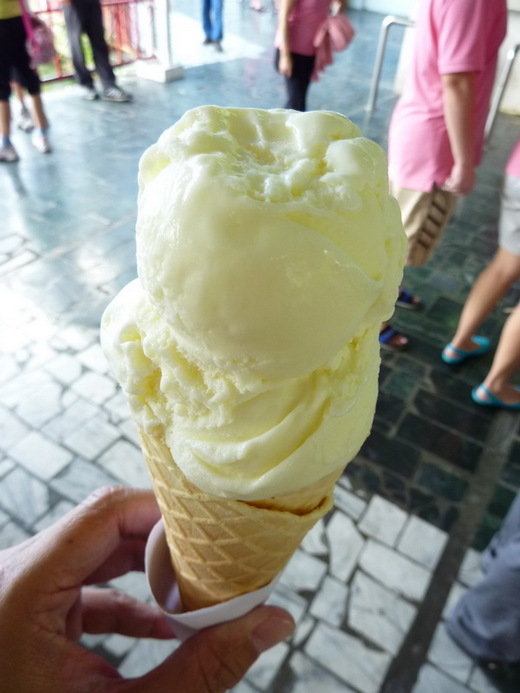 我拿起相機拍了幾張,凱問,要不要吃冰?我依循自己的旅遊原則,既來之則安之,看到那麼多人排隊買冰票,怎能不親自體驗看看?於是,我點了脆餅鮮乳冰淇淋、凱點了脆餅醉香冰淇淋,小亞則點了脆餅瑞香冰淇淋(薄荷口味),就蕭沒吃。