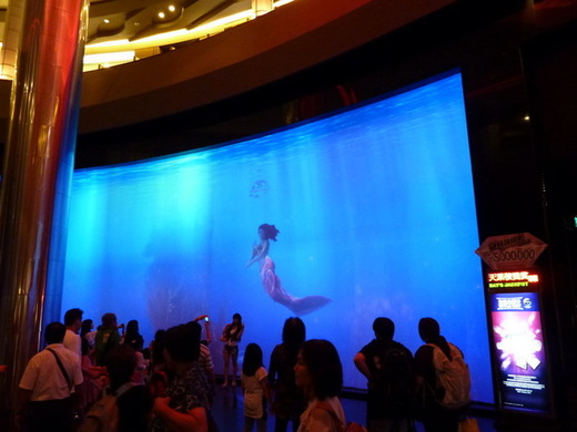 新濠天地娛樂場入口極其奢華,入口小廣場兩側有整面3D水幕,美人魚偶會現蹤其上,每每引來遊客拍照取景。