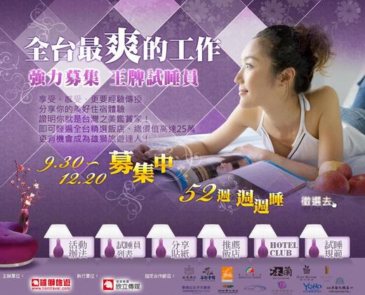 之前「雄獅旅遊」舉辦了一場名為「王牌試睡員」的遊記徵選活動,要選出幾位實習試睡員睡遍全台各大知名飯店,試睡員除了享受高檔飯店的環境與服務,更要把實際的住宿心得撰文分享出來;先經過第一階段的網友與達人評選後,再來是第二階段的臉書按讚比賽,最後選出三位「王牌試睡員」!