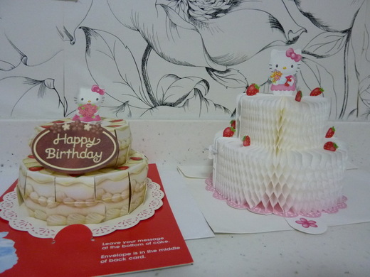 妳生日那天,我端出兩張卡片,不大的卡片,卻很立體,因為那是妳喜歡的HELLO KITTY,之前在書局發現的立體卡片代替實際的蛋糕將我的心意呈現給妳,妳開心得很,因為沒見過KITTY卡片居然能有這樣的小小驚喜。