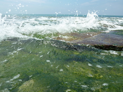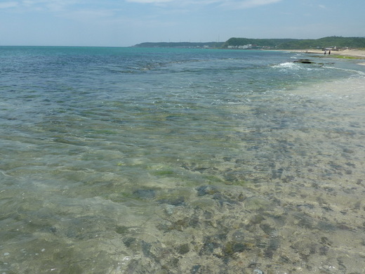 這處海灘有種簡潔的美麗,或許是藍天白雲之故,不管相機怎麼擺、如何拍,照片好看就是好看;另外,由於這兒接近綠石槽海岸,沙灘前緣也從砂粒慢慢轉成石礫,浪花前端就是淺淺的石槽突出,沾染了一些海藻,清清淡淡的,有份平靜的翠綠感。