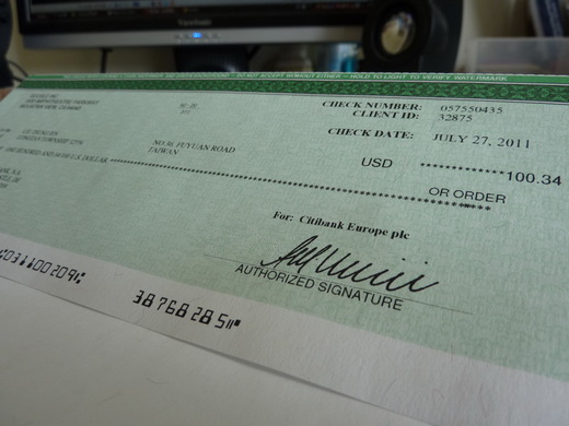 由於我一直沒留意到底目前累積的金額有多少,前陣子某天心血來潮登入GOOGLE AdSense看看,赫然發現原來已經累積有九十美元了,當下便開始期待突破一百的那天來臨,終於在今年六月份達到一百美元的目標,GOOGLE AdSense並在七月底將款項以支票形式支付寄出。
