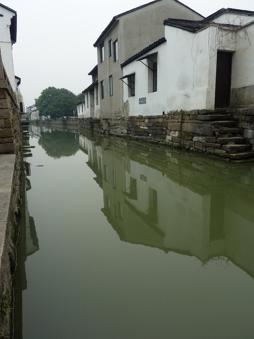 U緩緩走在前方,同我一起發現右手邊有河道,我們好像在比較誰比誰好奇似的走到河道旁階梯探看,那條綠色長帶就這麼靜靜躺在古意盎然的建築群落裡頭,我還特別伸出手將相機視角拉出去一點,想拍到較為全貌的河面,她也靜靜站在河道欄杆旁候著,嘴邊哈著白煙,也像一幅國畫。