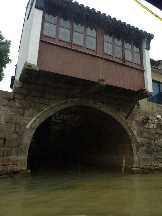 得記得一點,這裡是蘇州古城區,沿途都是一般民家,既然是在古時所謂的「住宅區」,房子也就不太可能有多華麗,當我們一邊欣賞沿途民家後門的模樣、一邊體會當地民眾生活時,導遊突然提高了音量,要我們快往右手邊看看,那就是古城河上最特別的跨河民家!