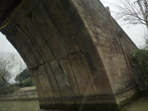 導遊給我們介紹眼前那座看起來舊舊的人行橋,他說這是目前蘇州古城河區最老的橋面,等會兒鑽過橋下時,大家可以看看橋座石塊的歲月痕跡;我就喜歡這種fu,相機準備好也順利拍到照片,只可惜因為是透過窗戶而拍,照片成像還是有玻璃鏡面的反射。