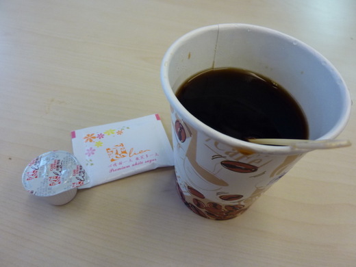 一分鐘後,兩杯熱咖啡送上桌,各附上一只糖包和奶球,三十元。
