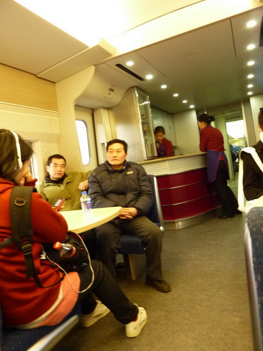 和諧號是有餐車車廂的,就像高鐵那般舒適,由於我們買票買得臨時,加上從小城到大城去,座位票難買,雖然買到回上海的列車卻沒有座位,原本我們還打好主意要在車門邊的空間小歇一會兒回上海,陰錯陽差之下踏入餐車車廂,也顧不得餐車車廂內該有的禮儀,既然眼前有座位,先坐先贏。