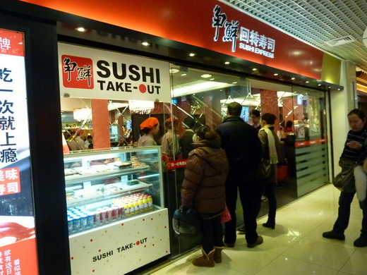 雖然美羅城比起港匯廣場是小了點,但在現在的我們心目中,吃比較重要,我們一路直上找到位於四樓的「爭鮮迴轉壽司」卻嚇了一跳,七點半多,店門口依然擠滿了人;U看到還得排隊,登時興起找其他店家的想法,我們又走下樓看看附近的壽司店,最後仍決定就吃爭鮮,主因是看起來比較平價,加上些許台灣風味的影響,她笑說,到底台灣來的東西還是吸引大陸人的。