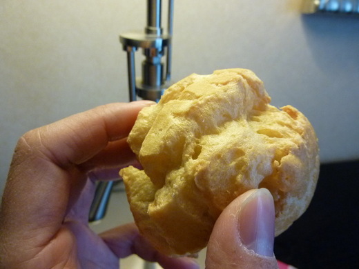 我們打算熬到最後幾分鐘才退房,現在才九點半,一身行頭大多昨晚已整理好,剩下一些隨身物品收一收、放進行李箱就可以了;桌上還有昨晚在「泡芙大師」買的兩顆泡芙,她拿起一顆、也給我拿了一顆,笑說,還是吃掉吧!