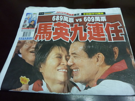 馬英九以六百八十九萬一千一百三十九票、百分之五十一點六的得票率成功連任,雖然是超過半數的支持度勝選,但跟四年前相比依然有落差,很多人說這是因為馬政府做的不好,可我覺得這樣的支持度才比較符合現在台灣藍綠的支持比例,四年前之所以有所謂的「狂勝」,實在是因為大家對形象清新的馬英九有太高期待、對貪腐的陳水扁(連同民進黨)有太多不滿使然,那樣的狂勝恐怕很難在接下來幾次大選看到,除非,當權者又犯了如阿扁那般不可饒恕的過錯,而且硬拗到底。