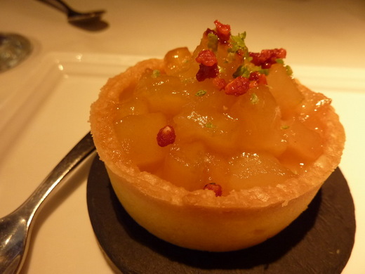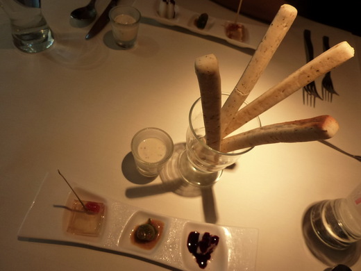 做足功課的老媽看到前菜與麵包送上桌,神秘兮兮地跟我們說,很多人在網路上說前菜裡的彩椒水蓮最好吃,雖然只有小小一株,吃個味道總是可以的,而且就那麼一口的滋味,竟如此令人印象深刻倒也罕見。火柴麵包搭配沾醬來吃確實特別,每人僅配給兩根實在有點少。