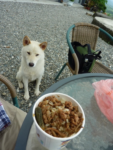 白寶看到我們回來顯得相當興奮,看到我手上的餐點更是欣喜莫名,我不知道牠平常吃什麼東西,未免害到牠的腸胃,一度不想搭理,不過白寶鍥而不捨地望著我和桌上的魯肉飯,最終我仍是屈服了。