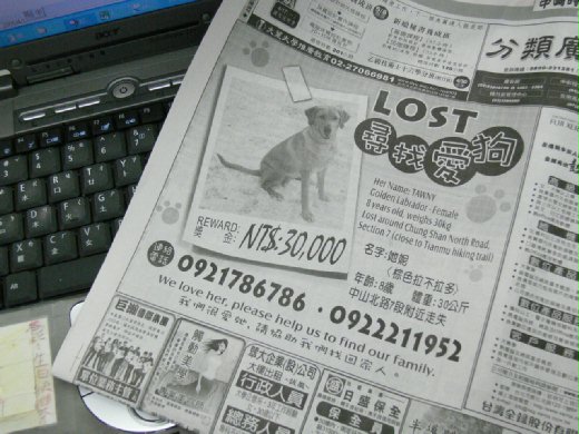 看到報上一篇「尋找愛狗」的分類廣告,由於篇幅不小,讓我以為是某種商品故弄懸虛的廣告,忍不住好奇打電話去問,發現這真的是在尋找愛犬,故事發生在一對加拿大籍夫妻身上。