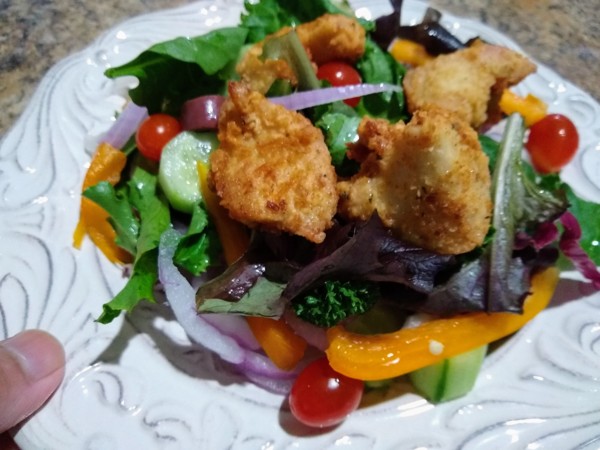 放在自己喜愛的生菜上,再淋上自己喜愛的沙拉醬汁(我愛希臘醬汁)。