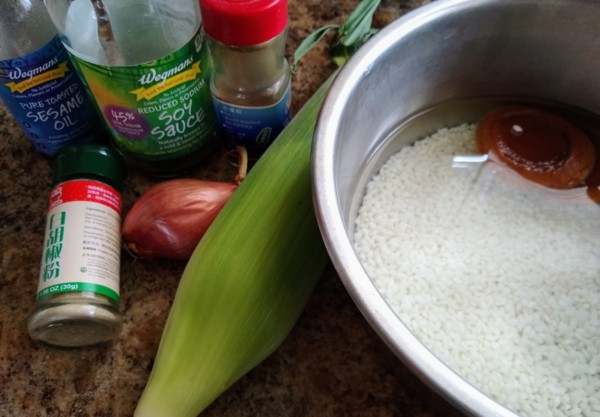 香菇和糯米事先泡水2小時,甜玉米連皮整根放到微波爐,微波3分鐘,拿出放涼。