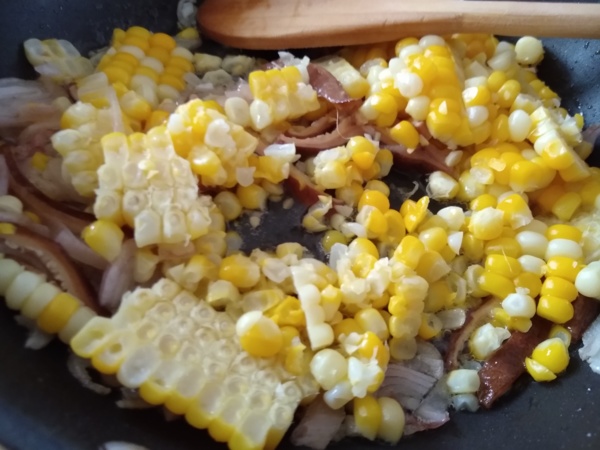把甜玉米粒切入鍋中炒勻,加入塩調味,