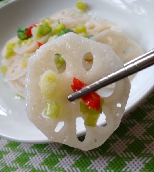 滚藕片之際,把蔥花、小紅辣椒丁放一碗,