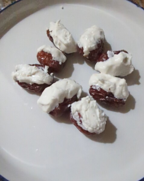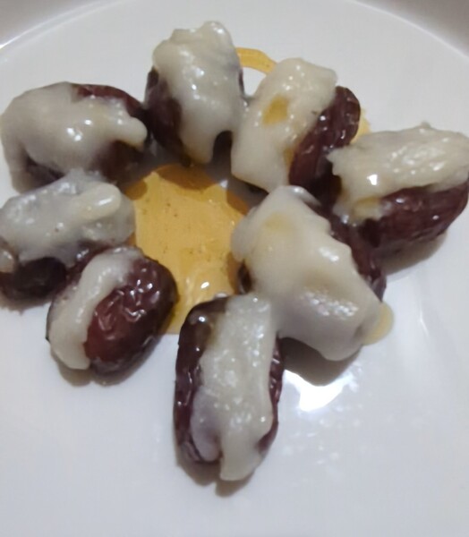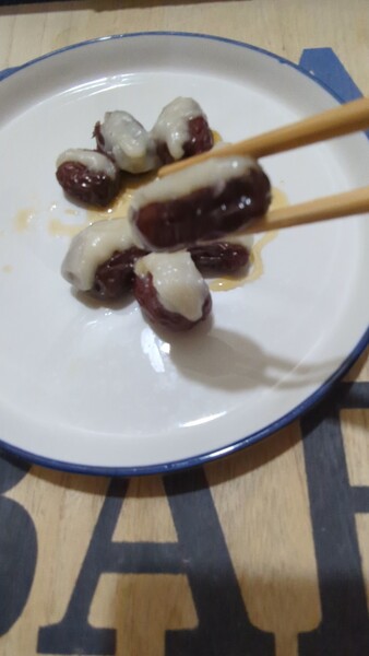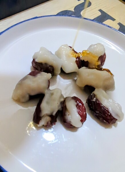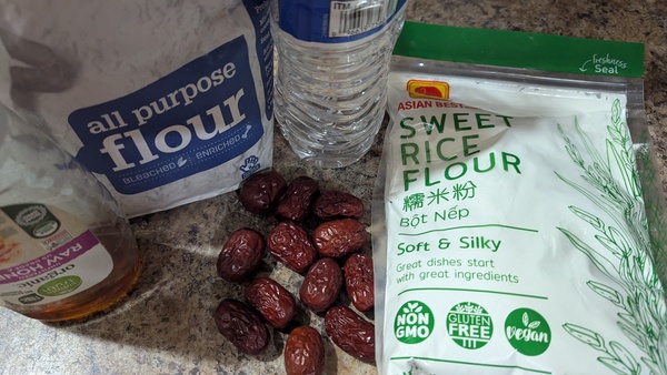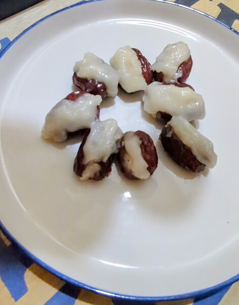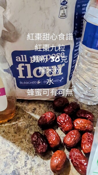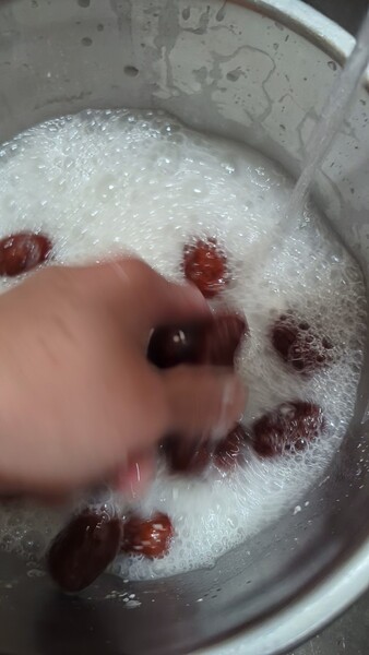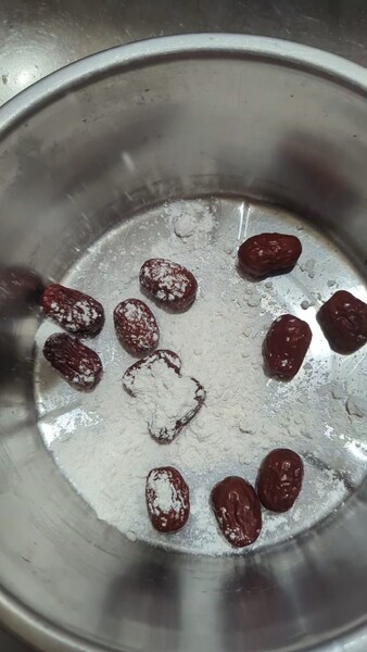 紅棗加中筋麵粉,加水搓洗乾淨。