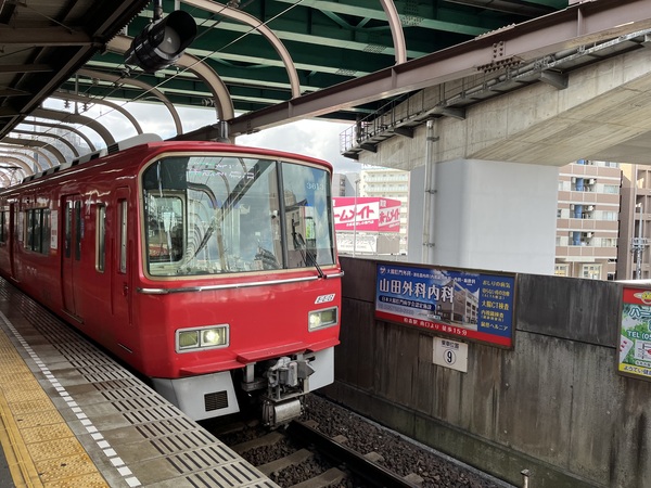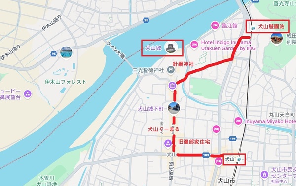 由於我們住在伏見站附近,因此在乘換案內的引導下,我們要先搭鶴舞線到【上小田井站】,接下來換乘名鐵犬山線到【犬山遊園站】。沒選【犬山站】的原因是,從地圖上看來從【犬山遊園站】走到犬山城比從【犬山站】走到【犬山城】來的近;不過後來發現這樣的選擇好處不在此,而是到犬山城的遊客一定會想逛犬山城下町,先攻城,晚點逛犬山城下町,可以好好逛商店,也不用擔心得提著伴手禮攻城,而逛完後,順著指標走到【犬山站】搭車即可。