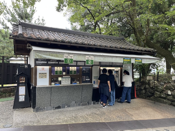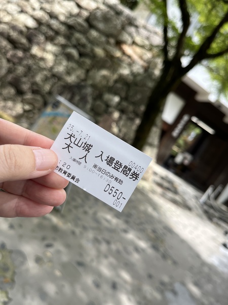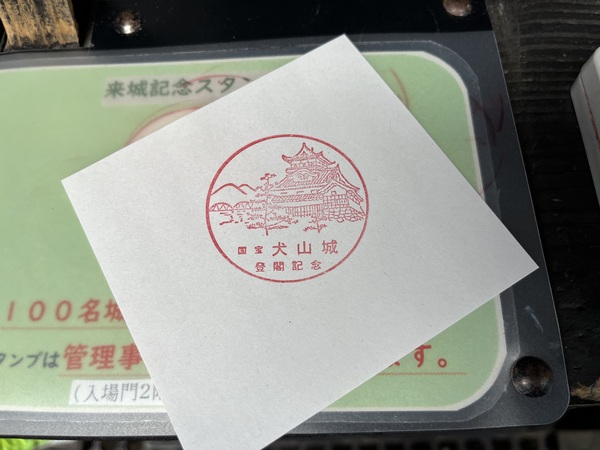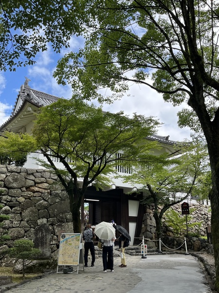而順著不算陡也不算長的坡道,走了約莫四五百公尺的距離,右側就出現售票處,再不遠處就是入園門,而且站在入園門就能見到天守閣,比起那天攻【彥根城】要輕鬆太多了。