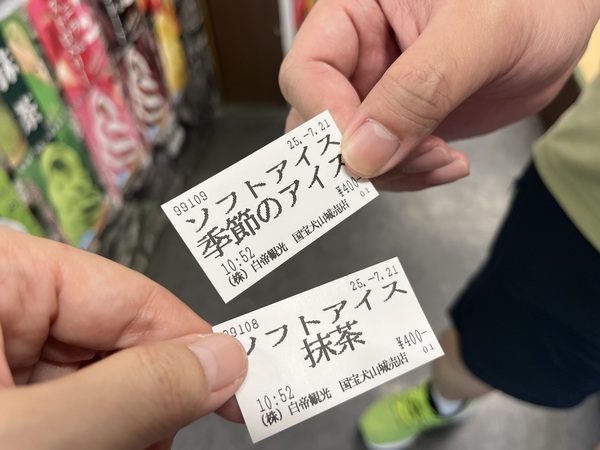 這天的天氣十分晴朗,是那種如果在戶外活動太久很容易就會中暑的天氣。於是滾下樓梯後,見到販賣部的冰淇淋,很難不嚐鮮。天氣熱爆了,即使在室內裡,我們依舊無法優雅品嚐冰淇淋的滋味,若不想弄得滿手濕濕黏黏的,就得跟冰淇淋融化的速度競賽。