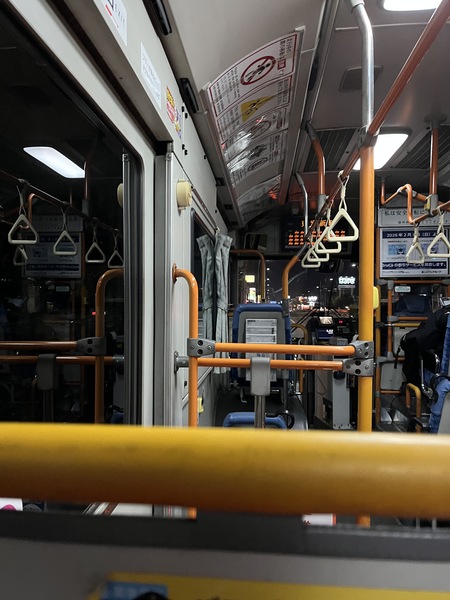 天黑黑的六點多,我們在公車站等不知道會不會來的公車,還好有椅子可坐,但實在太納悶了,因為一盞燈都沒有呢!這樣公車司機是要怎麼看到我們舉手呢?又或者在日本搭公車,不是舉手表示要上車?這頭一回的體驗,真是刺激啊!還好陸續有人也來一起等公車,只不過來的都是遊客,他們會不會跟我們一樣都是新手?……