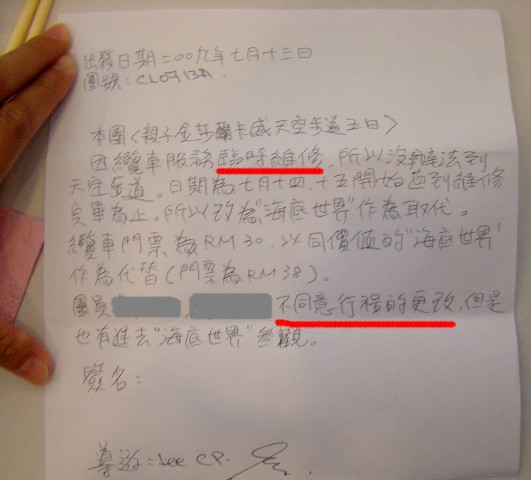 但是,旅行社並未告知行程那天是既定維修日,讓我們辛辛苦苦的經過陸海空大作戰後,才告知維修,但又說是臨時維修,還要我們白紙黑字簽名,想也沒想就拍照存證了!