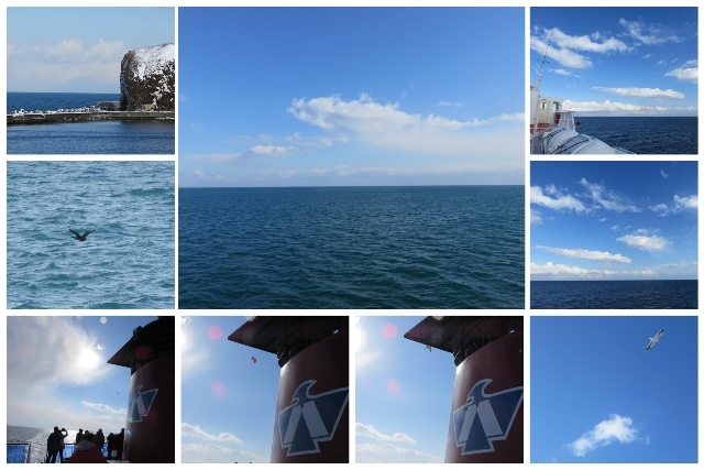 這回的天比上回藍,雪還一直飄個不停,如果不是特意要看流冰,只是看海,吹海風啊!那這天的感覺真的是挺舒服的,至少連很會暈車暈船的偽青年都沒有暈的感覺,而且啊!以欠航比率頗高的情況來看,兩次都能搭上船,應該是要開心的,尤其是第一次其實有破小冰,而且兩次都沒搭上晃得很嚴重的海盜船…..