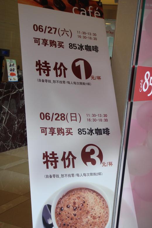 昨天在石路看到時, 那時大約10點半多! 85度C裡面人就很多了! 我跟老公也因為天氣熱也進去買一杯 “85咖啡”, 也就是85度C咖啡在台灣稱的 “特調冰咖啡”! 一杯8.-人民幣, 如果直接以匯率5相乘, 價格及物價指數都比台灣貴耶!