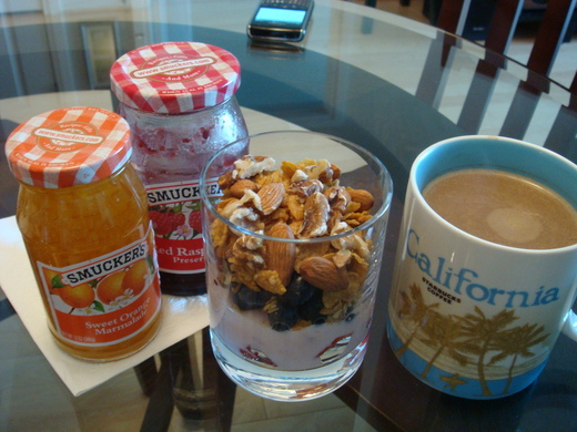 MINE: 優酪乳, 喜瑞兒, 核桃 2-3顆, 杏仁 3顆 + 新鮮草莓 & 藍莓 + 咖啡一杯