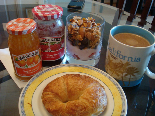 BF: 優酪乳, 喜瑞兒, 核桃 2-3顆, 杏仁 3顆 + 新鮮草莓 & 藍莓 + 咖啡一杯, 他是男生, 多一塊可頌麵包~~