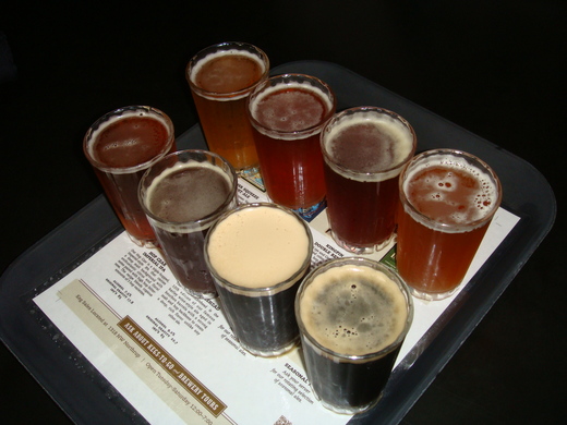這家常備6種不同口味的鮮釀啤酒, 再加上2種季節性的限量鮮釀, 第一輪叫了sampler, 就是每種都一小杯, 先嚐嚐看再決定要點什麼.
