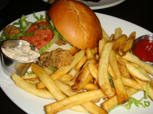 食物嘛, 我們點了一份 Beef Pie (既然是 pie, 也沒有派的樣子…) 口味也偏甜了些, 還點了一份炸蚵漢飽, 蚵仔只有5小顆, 麵包是很大很厚, 再加上一堆薯條 (PS:要不然會吃不飽, 難得在美國的餐廳吃飯是會覺得回家還要吃消夜的…), 嚴格說來, 只有薯條還算不錯, 其它真是普普通通, 青青菜菜…