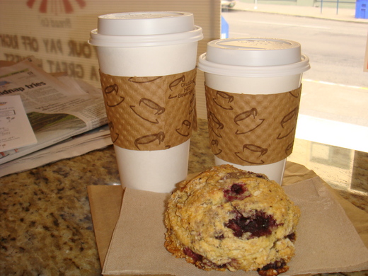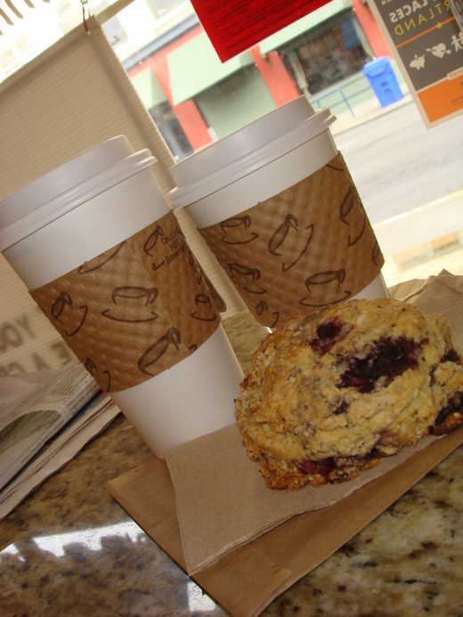 逛著逛著經過這一間麵包店 (PS: 是如假包換的麵包店順便賣早餐跟三明治), 店家標榜每日現磨現烤的麵包 (老外的麵包沒像台灣的麵包店變化多端, 大多是不同口味的吐司跟馬芬, 司康餅之類的) 看在一杯咖啡加一個馬芬才 $3.2 的份上 (還有馬芬看起來很棒的樣子!), 就點來試試看 (但是看到雜莓司康餅剛出爐, 馬上改點咖啡 + 司康餅).