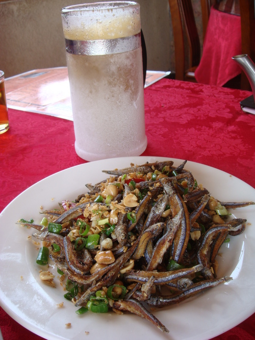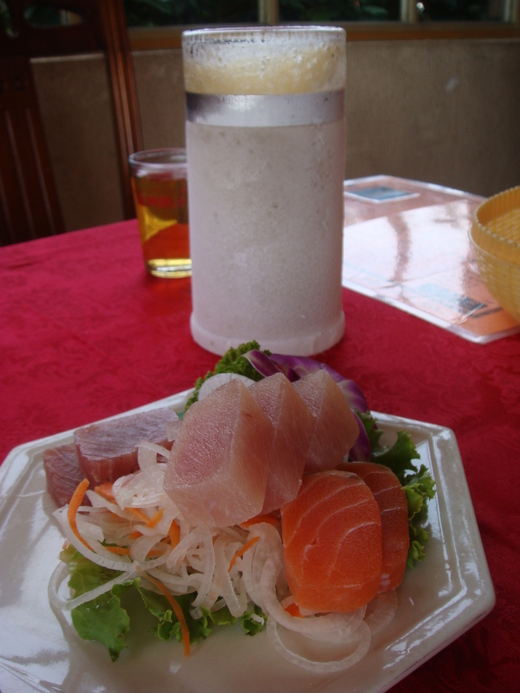 下酒菜來了生魚片, 丁香花生和炸豆腐. 這丁香花生的小魚乾肥美又不硬, 真的很棒, 我一個人就可以吃掉一盤!