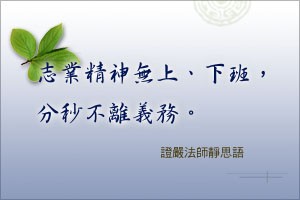 而在靜思語中則提到志業的精神在於「無上、下班,分秒不離義務」,所以就明確的說明了從事慈濟是一種必須將其精神、暨各項對外之宣示暨言論融入日常生活中,而不是拿著慈濟的帽子做一些違背其精神之事。