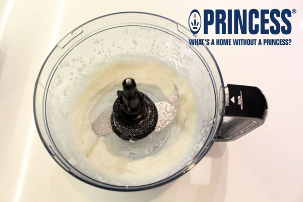 第一步是將剛煮好的白飯和地瓜粉搓揉成團。我比較偷吃步一些,直接用食物處理機來混合這兩個材料;假如你跟我一樣也想用機器來打「米」糰,刀片要選擇大刀才能達到我們要的目的。