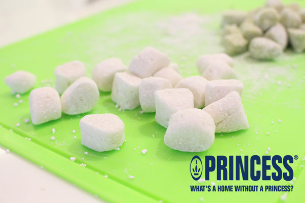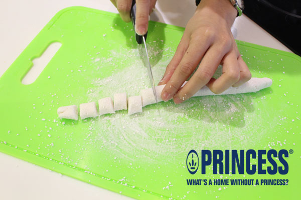 不過在非常阿莎力的下地瓜粉後,可愛的米糰就成型了!搓揉成條後,切小塊放一旁,等待第一次的汆燙。
